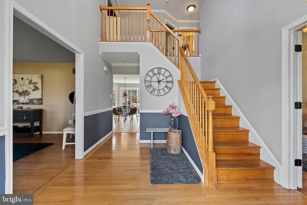 Timeless elegance meets modern comfort in this beautifully maintained home featuring a side-entrance garage, welcoming portico porch, lush mature landscaping, and a spacious flat lot tucked away on a quiet cul-de-sac. Step inside to a grand two-story foyer with hardwood floors, chair railings, crown molding, and a striking central staircase with landing that creates an unforgettable first impression. French doors off the foyer open to a spacious bonus room/flex space with large windows — could be a den, office or easily converted to a main-level bedroom if desired. If you work remotely or need dedicated office space, this is the one! Enjoy blazing-fast Ting internet, reliable underground power lines, and two versatile rooms perfectly suited for private home offices. The open-concept kitchen, breakfast area, and family room create effortless flow for everyday living and entertaining. The family room features a fireplace with raised hearth, while the kitchen and breakfast area showcase ceramic tile flooring, abundant white cabinetry, granite countertops, a deep double stainless-steel sink, and an island with gas cooktop. The bumped-out breakfast area is filled with natural light and offers a sliding glass door to the maintenance-free deck spanning the full length of the home. The deck is the perfect setting for stylish entertaining or relaxing evenings outdoors. The ceramic tile flooring extends from the kitchen into a hallway connecting four distinct areas: a spacious half bath, laundry room with deck access and closet, access to the double garage, and a versatile bonus room ideal as a library, office, or creative retreat — seamlessly connected to the dining room through French doors. Upstairs, the sunlit landing leads to three generously sized bedrooms with ample closet space and easy access to a full bathroom. The primary suite is a true retreat, offering a large walk-in closet and a spa-like bathroom filled with ample natural light. The walk-out basement is fully illuminated with recessed lighting and offers exceptional versatility. A large recreation area accommodates a pool or ping pong table, flowing into a flexible bonus space perfect for a gym, craft room, or additional office. A dedicated game area and bar make this level an entertainer’s dream. A half bathroom, spacious storage room, and utility area complete the space. With its thoughtful layout, abundant natural light, and seamless flow, this home offers comfort, flexibility, and style for today’s lifestyle. Conveniently located minutes from Baltimore, DC, and Frederick. Style. Comfort. Convenience. This is the one. MAJOR UPDATES INCLUDE: 2025 - New architectural shingle roof installed. 2024 - HVAC/Furnace replaced in the basement. New carpet, paint, and bar installed in basement. Kitchen refrigerator replaced. 2022 - Patios installed. New Garage Door. Basement and deck sliding doors replaced. 2021 - Rheem 50-gallon water heater installed. 2020 - Granite counters installed in the kitchen. Invisible dog fence installed.